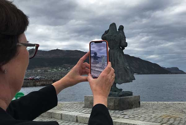 –Lokale historier fortalt av lokale kjente figurer, er en viktig måte å formidle historien vår på, og å bruke ny teknologi gjør det enda mer spennende. Gjennom hologrammene får dere møte personer fra forskjellige tidsepoker, fra vikingtidentil de som levde på handelsstedetfor 200 år siden. På Slippen hilser du på fiskeren som måtte ha hjelp med båten sin.Ved statuen av Fiskerkona smyger det seg frem et hologram av sønnen som tror faren kanskje ikke kommer hjem igjen fra fisketuren, på det stormfulle havet.